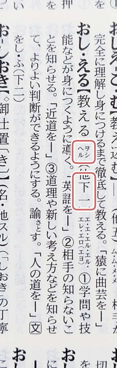 なほ活用語の場合、見出し語には語幹と活用語尾の切れ目が記号(例示の辞書では「・」)で示されてゐます。正かなづかひが表記されてゐない語の場合、語幹の書き方は正かなづかひでも変はりません。表記されてゐる語の場合は、下から数へた同じ字数分が活用語尾、その上が語幹です(例示では見出し語は『おし・える』で、「える」は2文字なので、正かなづかひでは下の2文字「へる」が活用語尾とわかる)。